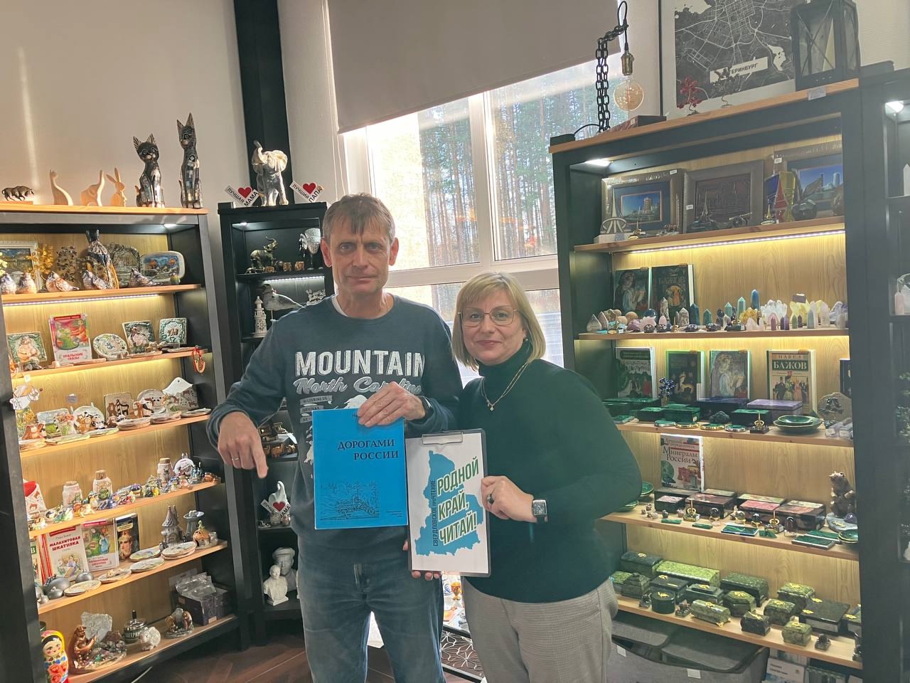Семенов М.Г. и директор библиотеки Абубакирова МУчастники акции у стеллы Европа Азия