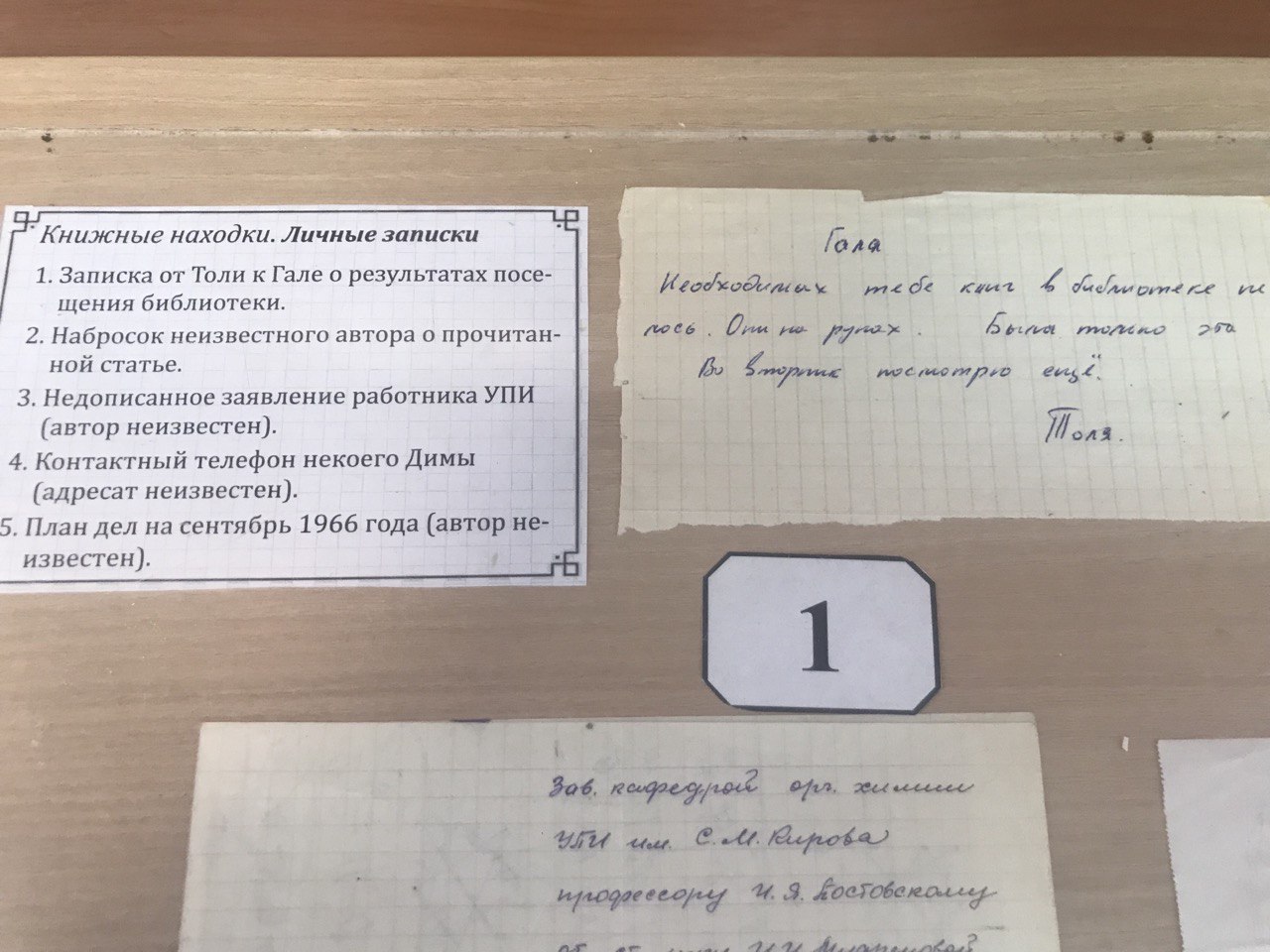 На выставке представлены первые диссертации, защищенные в УЛТИ; первые книги и журналы, поступившие в фонд; уникальные экспонаты, представляющие вещи, оставленные читателями в книгах на протяжении десятилетий.