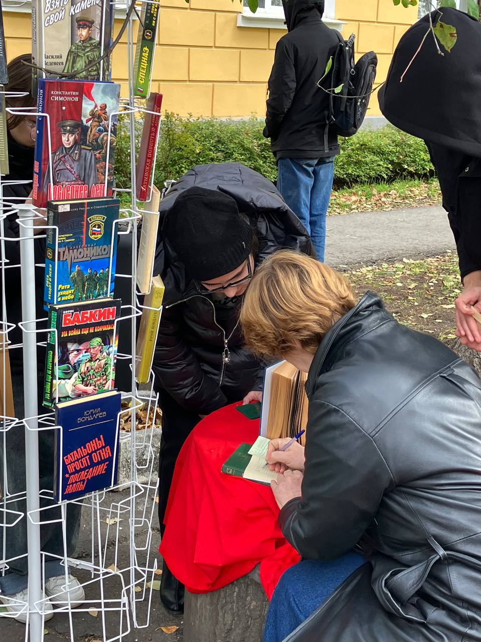 Для проведения Акции была выбрана площадка перед центральным входом в УЛК-7. Впервые в Акции приняли участие студенты 1 курса Уральского лесотехнического колледжа. Мероприятие прошло в формате стихомарафона. Студенты читали стихи нон-стоп о Великой Отечественной войне, о героизме советских солдат, стихи о боли и страданиях, о силе духа и надежде. Стихи Юлии Друниной, Александра Твардовского, Ольги Берггольц, Константина Симонова и многих других в исполнении чтецов звучали эмоционально, искренне, проникновенно. В этих стихах – живые истории человеческих судеб.  К студентам присоединились и их наставники: директор колледжа О.Е. Соловьева, зам. директора по воспитательной работе и социальным вопросам И.С. Таскаева, зам. директора по учебно-производственной работе В.А. Борисова, преподаватель истории В.М. Гонгало. Как всегда, на Акции нашим студентам предоставляется возможность записаться в библиотеку «здесь и сейчас», как реальное воплощение девиза: «Мы выходим за стены библиотеки, чтобы быть ближе к своему читателю!».